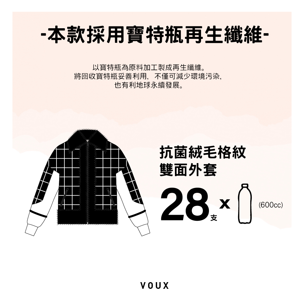 COZEE 抗菌系列格紋印花與毛絨拼接雙開拉鍊兩側拉鍊口袋袖口剪接裝飾雙面穿著