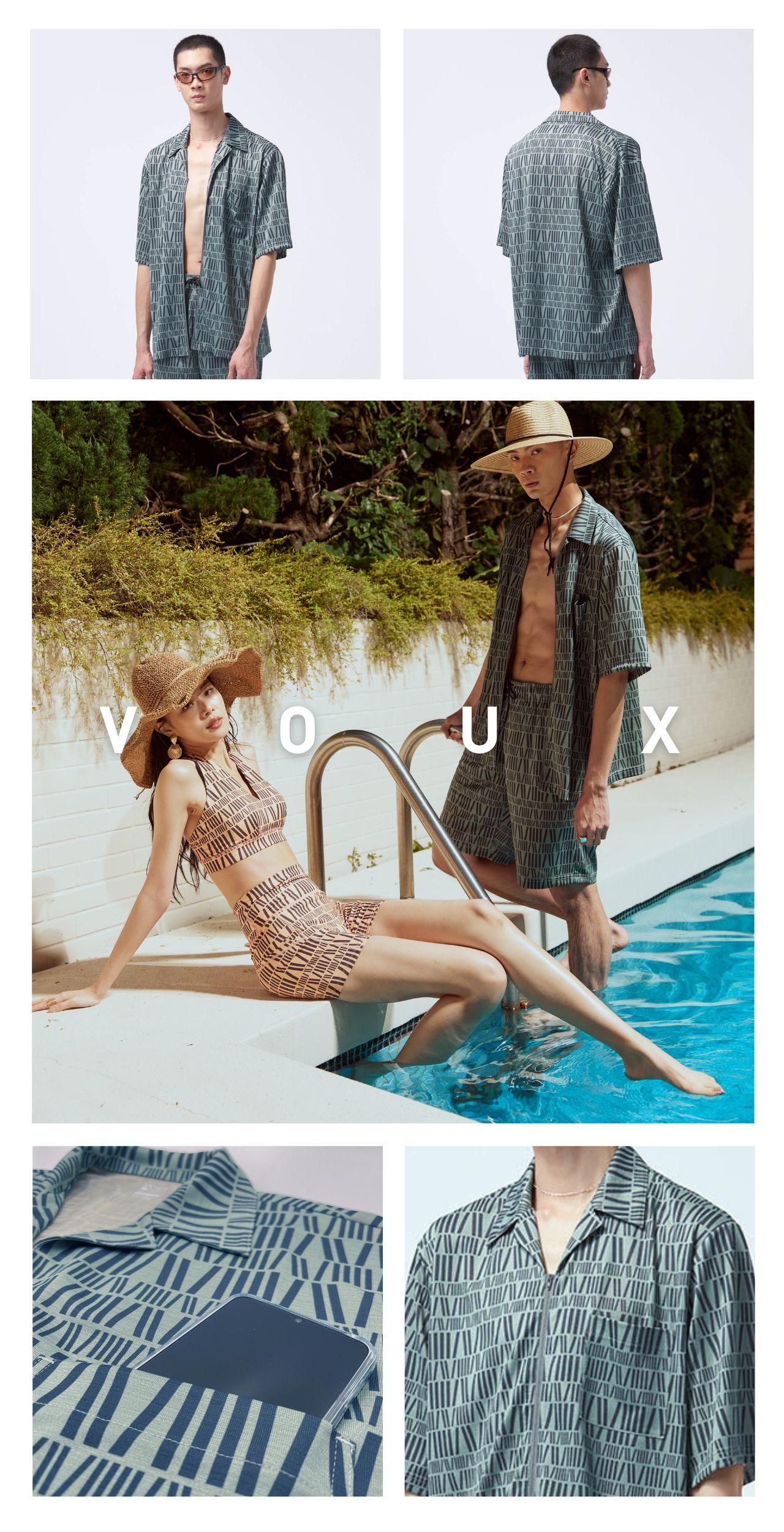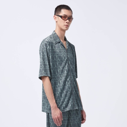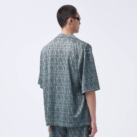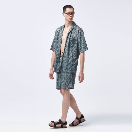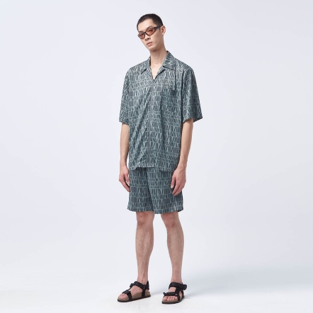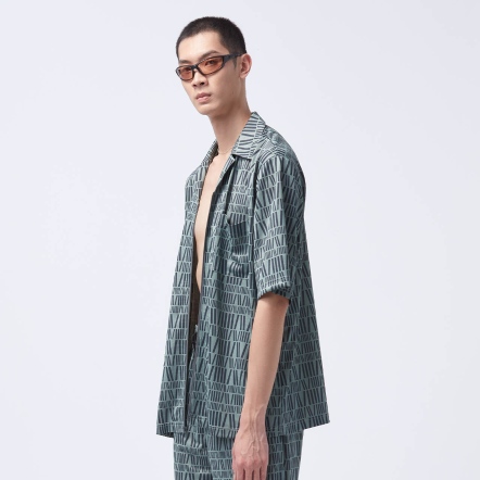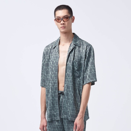 前拉鍊設計前胸口袋,簡單收納古巴領造型,展現南洋風情LOGO滿版印花,亮光紋理面料遠紅外線甦活機能吸濕排汗,抗菌除臭