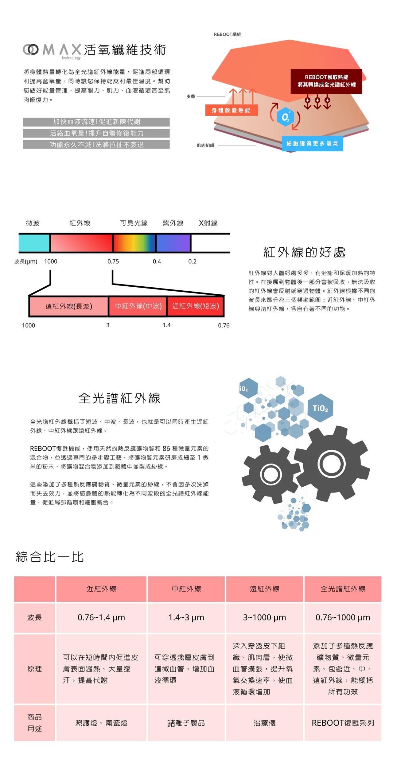 本款採用O2MAX活氧纖維技術,鑲在紗線中的天然礦石,能在穿著時將體溫轉換為遠紅外線能量,加快血流速並活絡血氧量,幫助身體恢復理想狀態,穿著效果因人而異,於高度疲勞或運動後穿著效果愈加顯著!