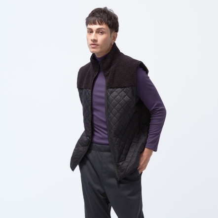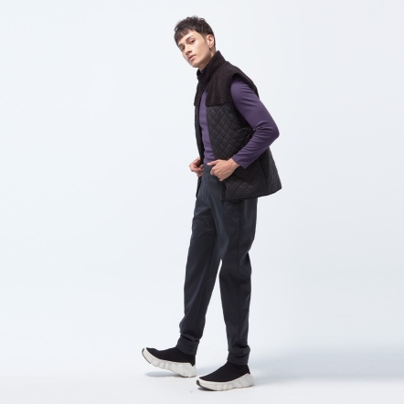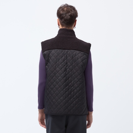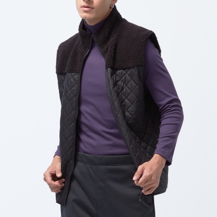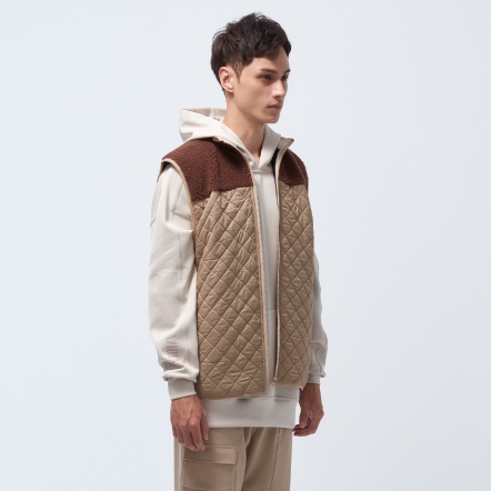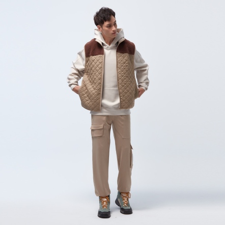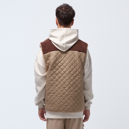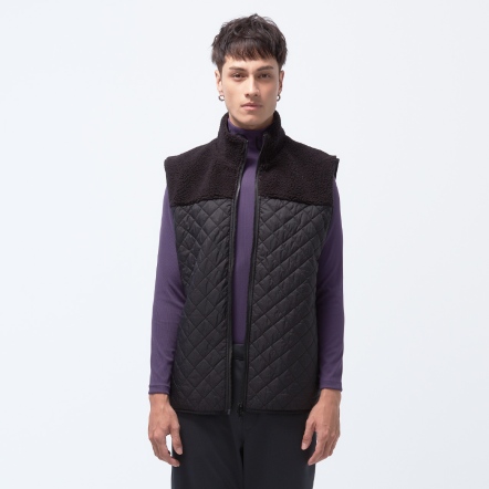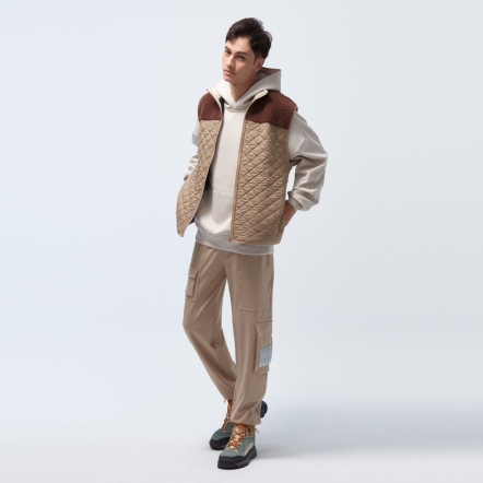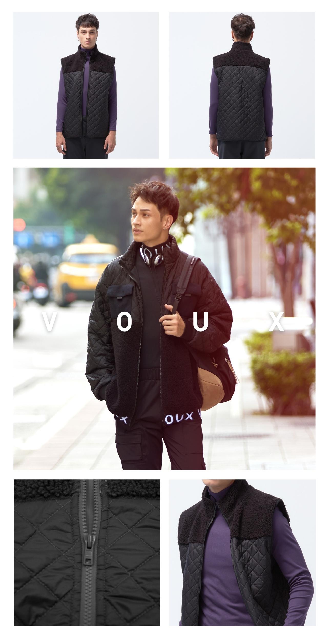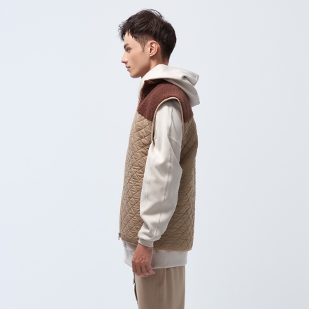 防潑水保暖效果再升級,夾層使用有效提升體感溫度的石墨烯棉,內層使用親膚保暖的甦活布料,並以衍縫工法扎實結合內外層,達到最嚴密的保暖效果。最後與羊麗絨拼接成立領俐落線條背心,集結各大保暖元素,絕對是冬天禦寒的最佳外著。