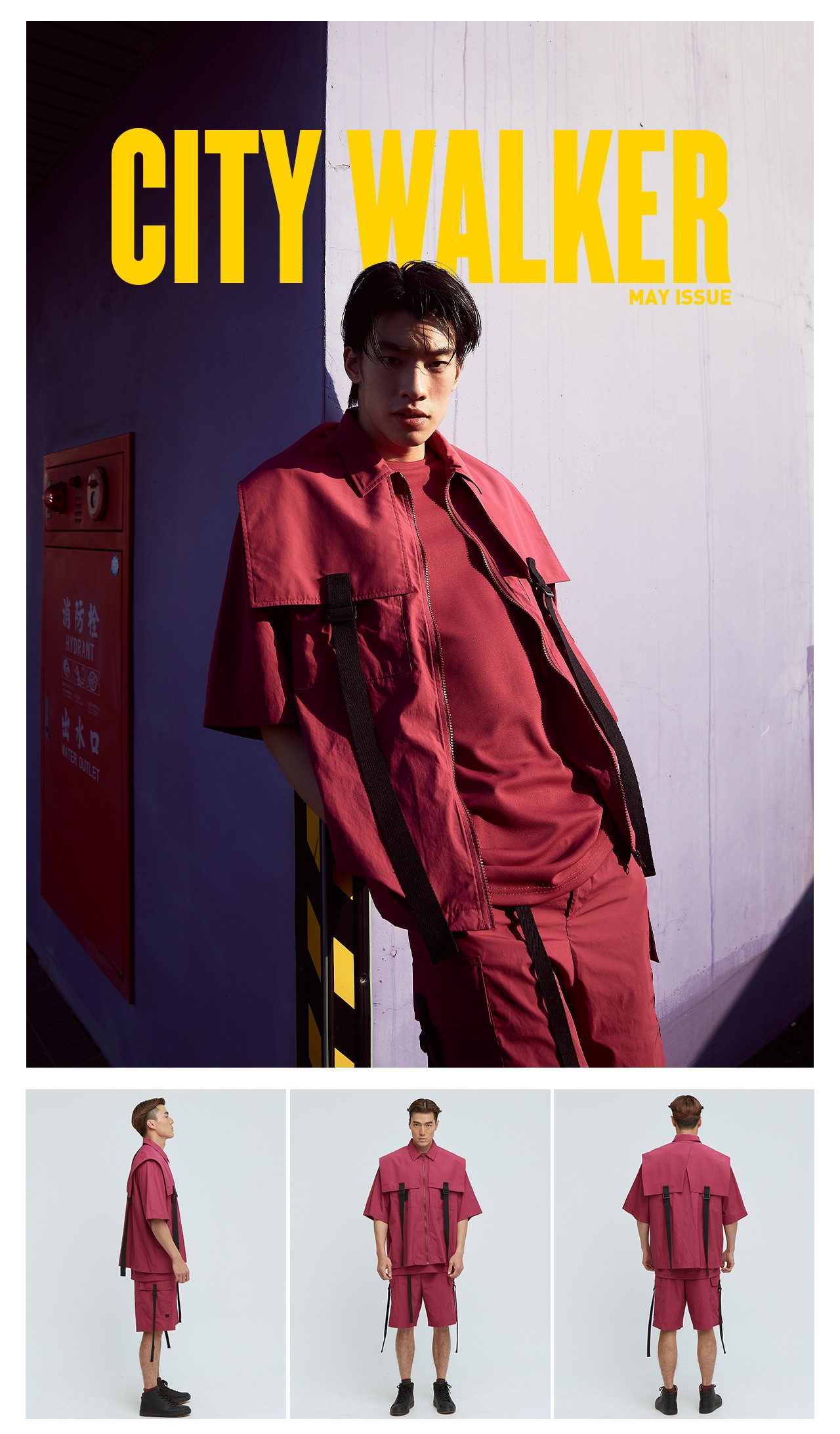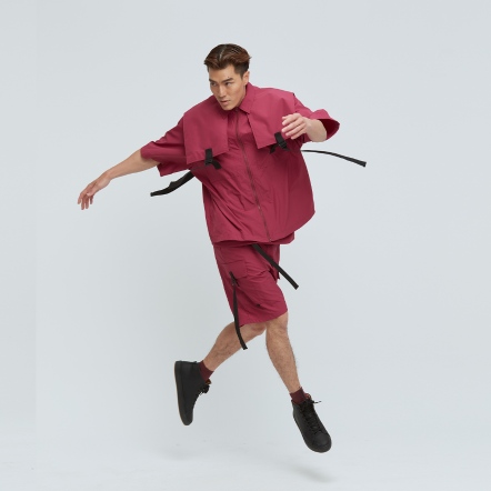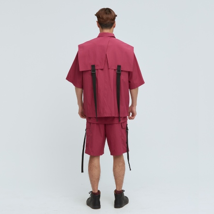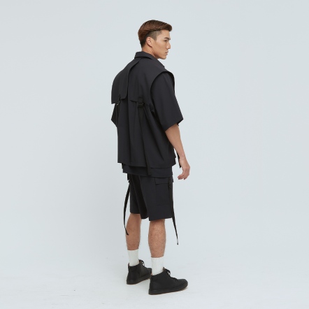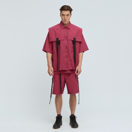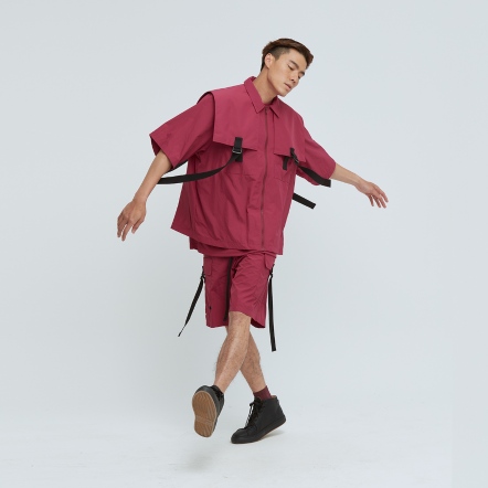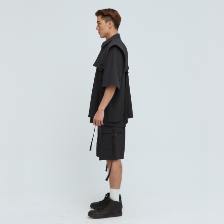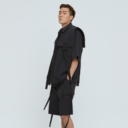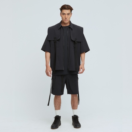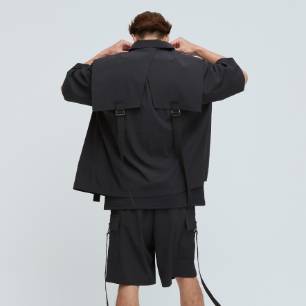 充滿特色的肩片配上可調節織帶,打造出工裝特色單品,胸前的兩個大口袋,實用又好看,五分袖與涼感面料舒適不悶熱,絕對是這個夏天最有型的外套,可搭配同款工裝短褲成套穿搭。