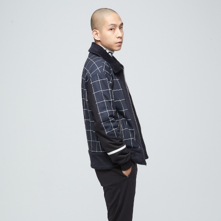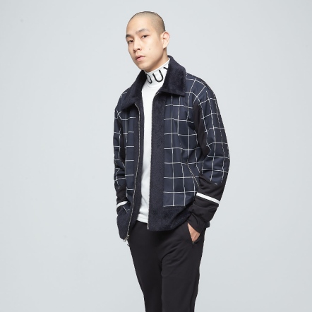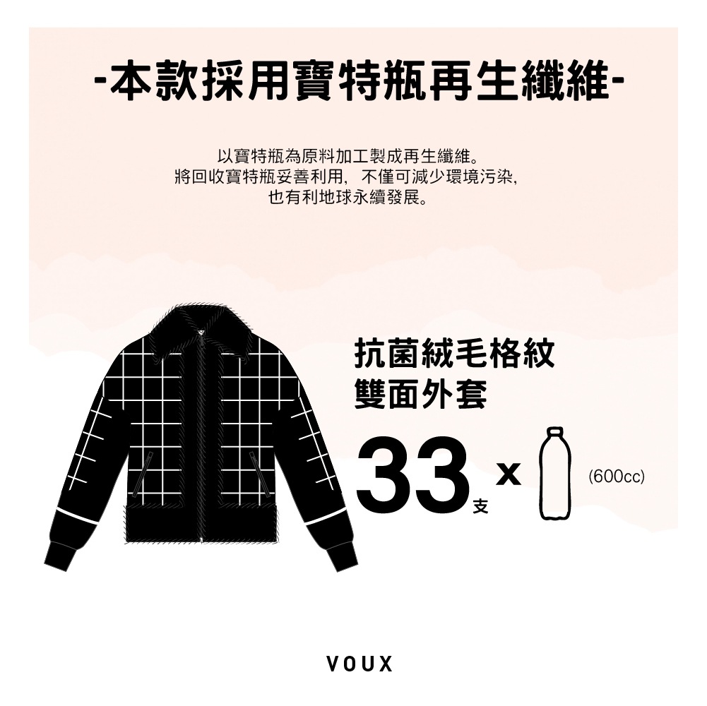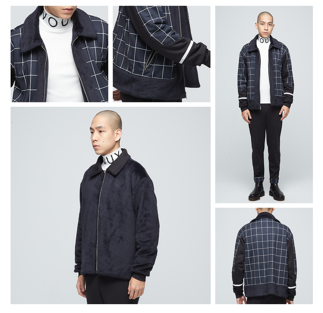 格紋印花與毛絨拼接雙開拉鍊兩側拉鍊口袋袖口剪接裝飾雙面穿著