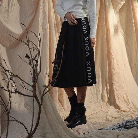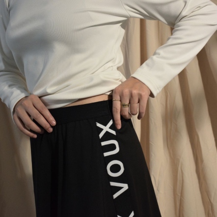 A字中長裙加上兩側VOUX訂織緹花織帶,別具特色與魅力。附有兩側口袋,方便收納,面料高彈環保再生紗透氣舒適、遇汗不黏身,穿起來如絲絨般滑順,觸感極佳!隨意搭配上衣單品,就能個性有型。