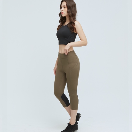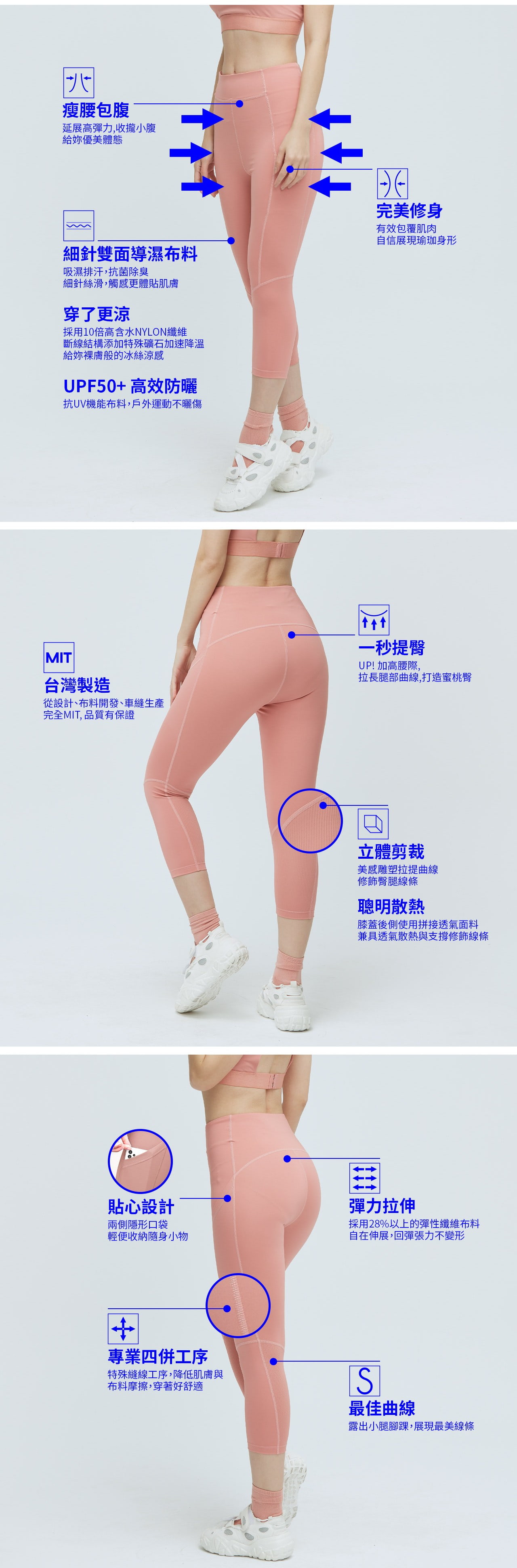 高腰褲型,具有修腹效果後膝採透氣面料拼接,兼具散熱及修飾效果10倍高含水纖維,涼爽舒適增加兩側口袋,方便實用