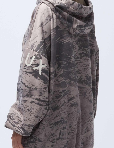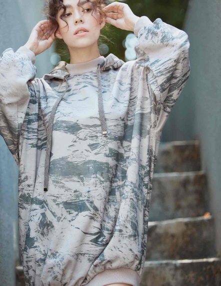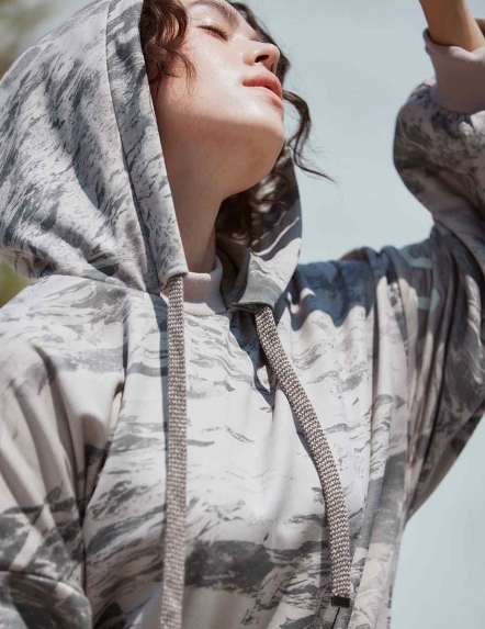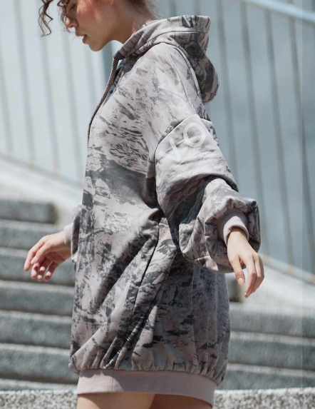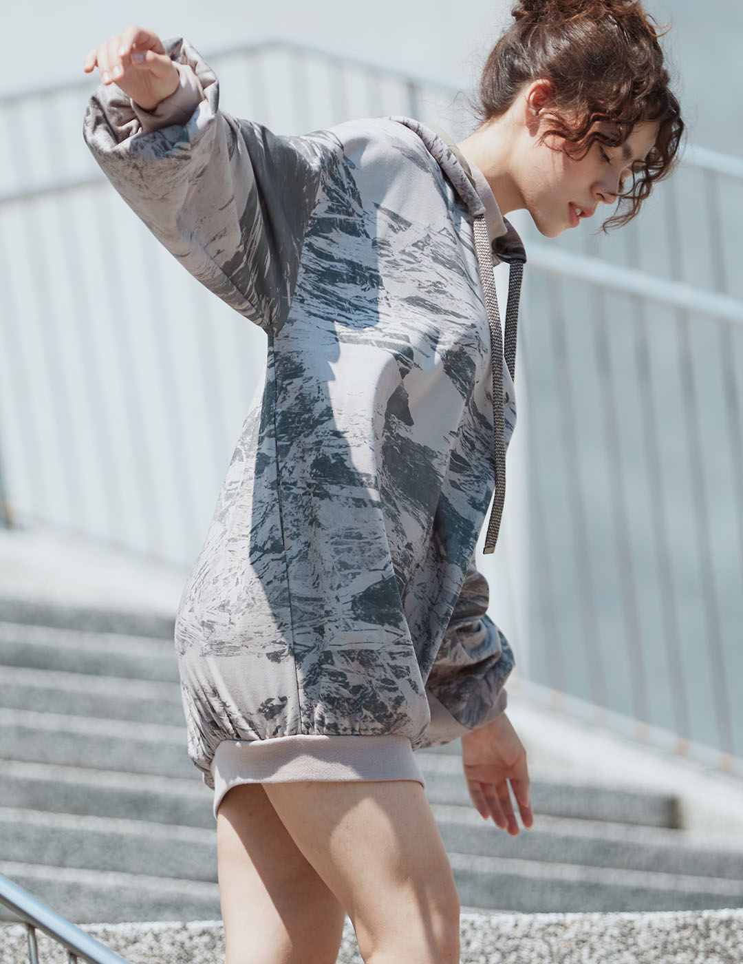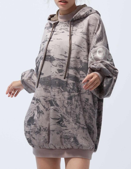 商品特色COZEE 抗菌系列彈性羅紋束口,修飾身型連帽寬版編織抽繩,可自由調節空氣感袖型,修飾手臂線條,多變穿搭|可當洋裝或長版上衣山系岩石印花加上品牌LOGO膠印造型,更增添活潑感