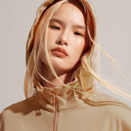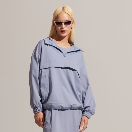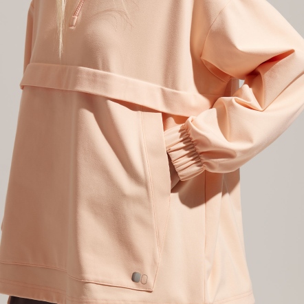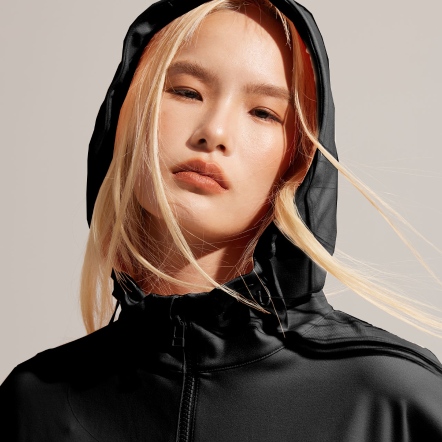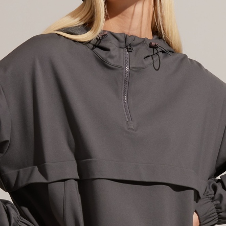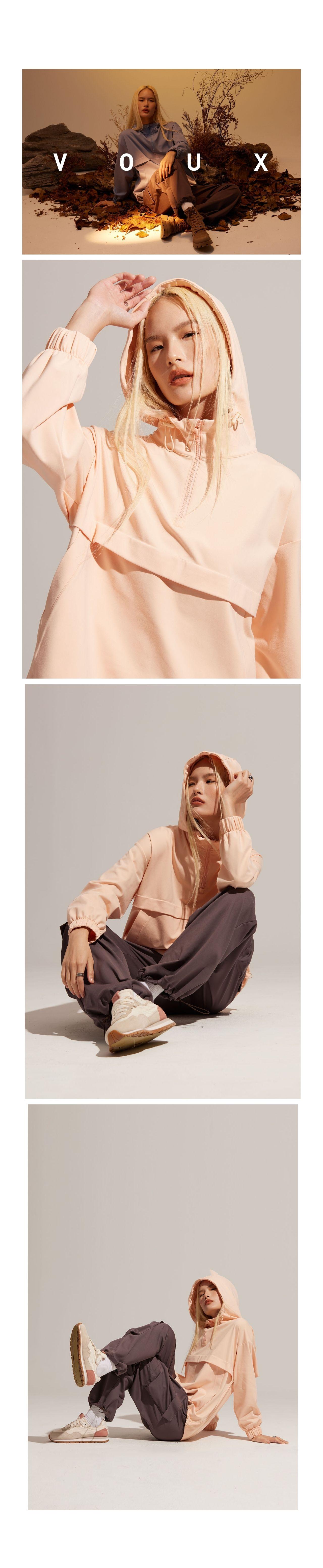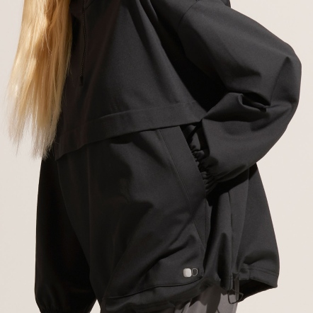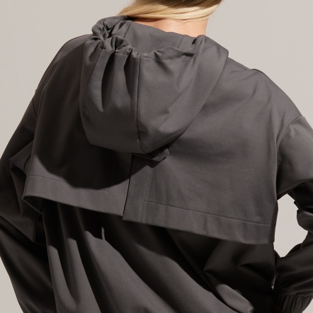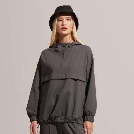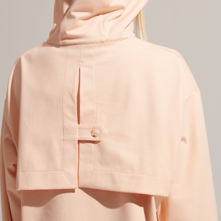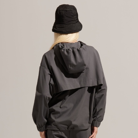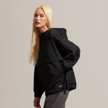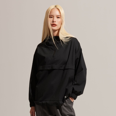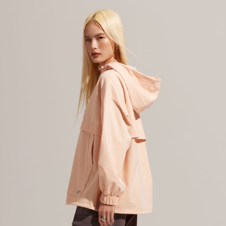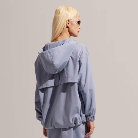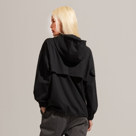 半開襟拉鍊為基底的連帽衝鋒衣,以機能材質打造日常穿著,滑順面料具有吸濕速乾、抗菌除臭的功能。正面配有大口袋增加收納空間,提升機能性。袖口、領口皆有高彈性的鬆緊帶。立體廓型搭配率性俐落的背扣披風設計,使整體造型更富有層次感。