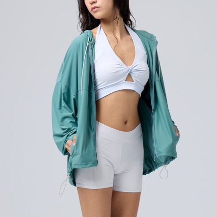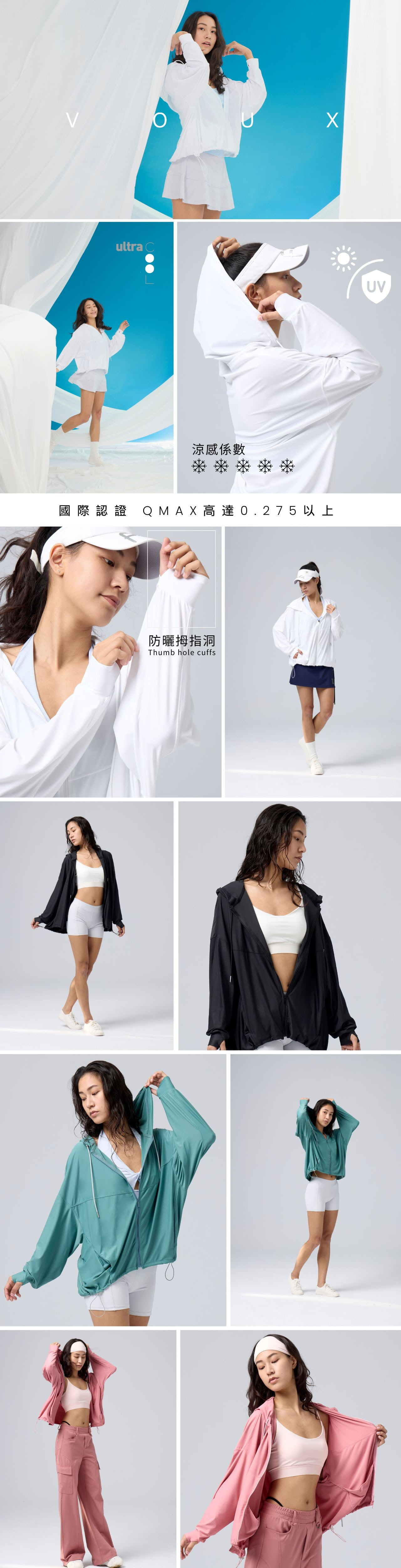 將奈米級玉石粉末填入冰絲機能纖維共紡,搭載瞬乾涼感機能,遇水或汗水可迅速蒸散濕氣,保持肌膚乾爽沁涼,即便潮濕環境下亦能維持輕盈貼膚觸感。布料通過UPF50+專業防曬認證,高效阻隔98%紫外線,結合抗UV與物理降溫雙重防護,適合泳後上岸、戶外運動或高溫通勤等情境快速穿著,完美平衡機能性與日常風格。